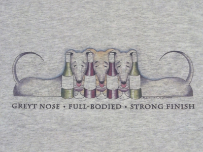 A whimsical Linda K Evans original design for wine enthusiasts who love greyhounds!