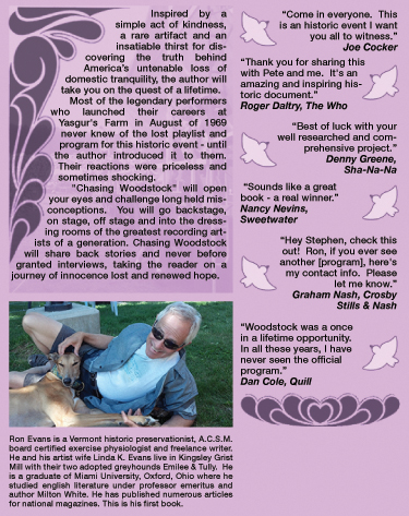 Vermont author Ron Evans breaks new ground with his first non-fiction adventure. Chasing Woodstock is a must have for the coffee table of "hippies" from every generation ( millennial to boomer ) with visually exciting content and more than 100 exclusive photos.