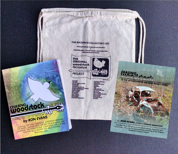Chasing Woodstock and Erasing Woodstock, both editions coded, signed, and numbered, in a natural cotton backpack with author inscribed quote on the inside.